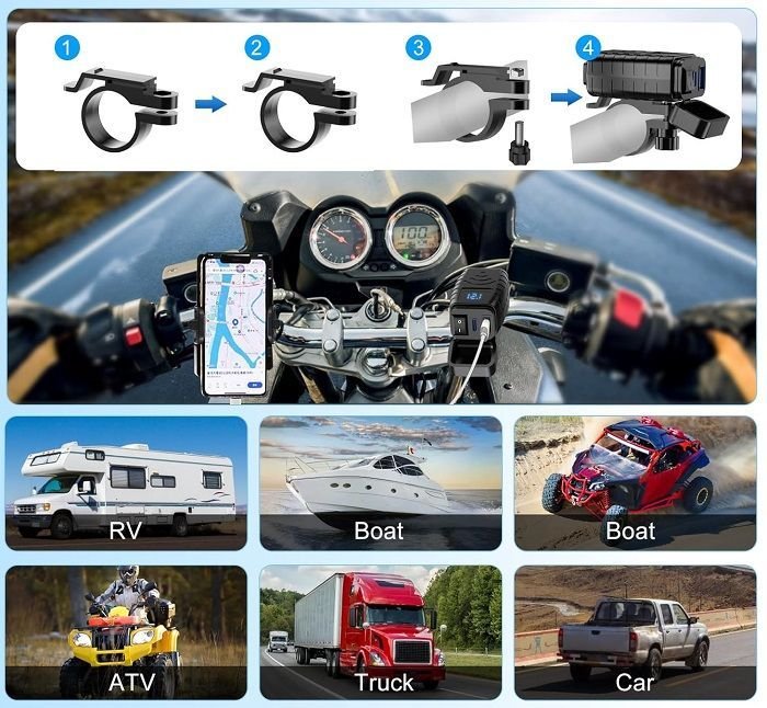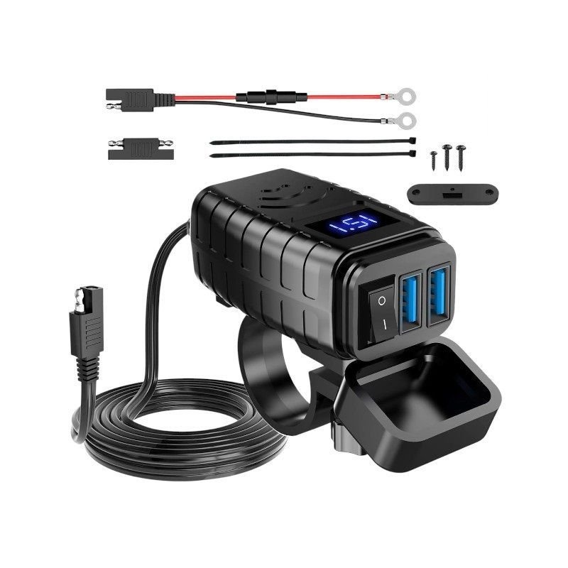 Αντάπτορας φόρτισης μοτοσυκλέτας με ψηφιακή οθόνη, 2 θύρες USB και εργονομικό σχεδιασμό τοποθέτησης στο τιμόνι.