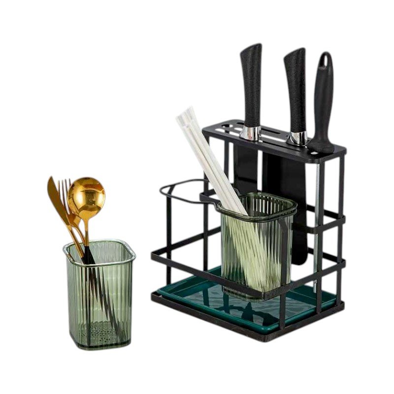 Μεταλλική βάση οργάνωσης και αποστράγγισης μαχαιροπίρουνων, με ειδική θήκη μαχαιριών και γυάλινες αφαιρούμενες θήκες πιρουνιών-κουταλιών.