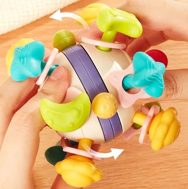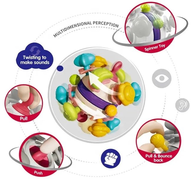 Βρεφικό παιχνίδι μπάλα με μασητικά άκρα που κινούνται και κάνουν ήχους, από μαλακό υλικό, μη τοξικό και ασφαλές.