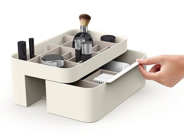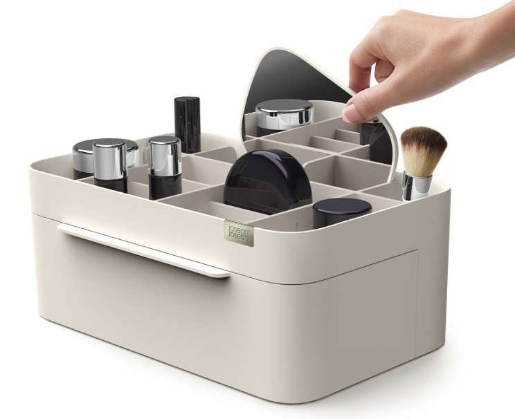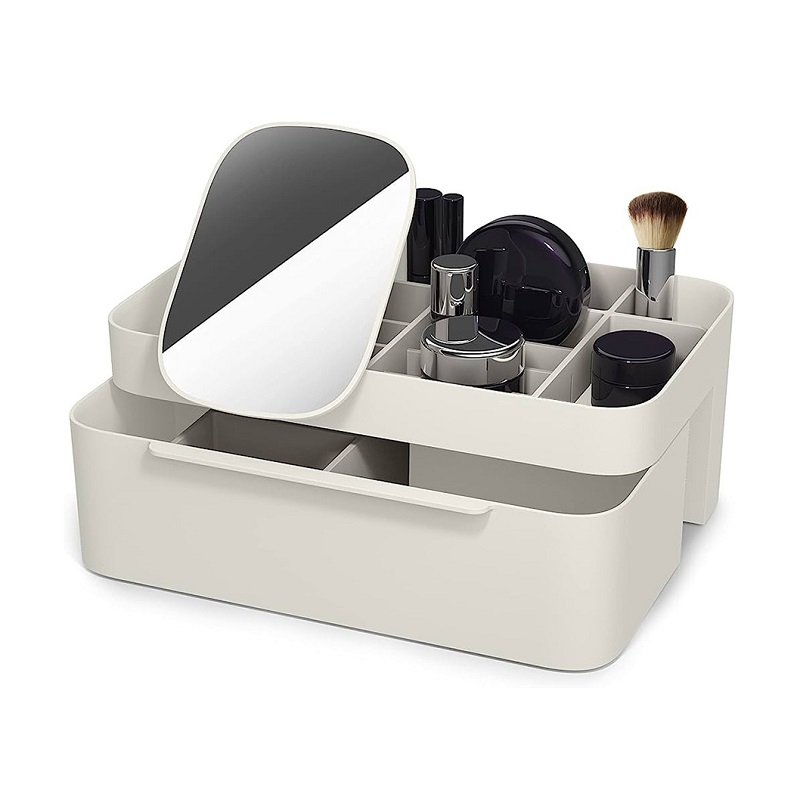 Επιτραπέζια βάση οργάνωσης καλλυντικών και μπιζού, με ενσωματωμένο καθρέπτη, συρτάρι και πολλαπλές θήκες οργάνωσης, με εργονομική σχεδίαση εξοικονόμησης χώρου.