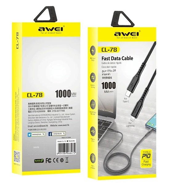 Καλώδιο γρήγορης φόρτισης και μεταφοράς δεδομένων Type-C σε Lightning – CL-78 της AWEI.