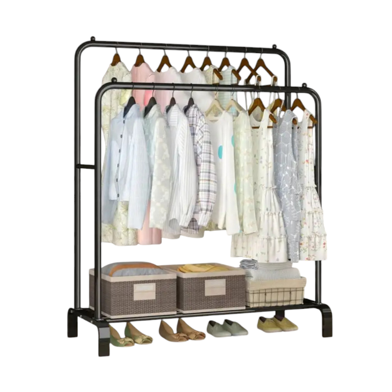 Κρεμάστρα δαπέδου μεταλλική, με 2 ράφια παπουτσιών, ιδανική ως έπιπλο εισόδου ή για την οργάνωση των ρούχων στο δωμάτιό σας.