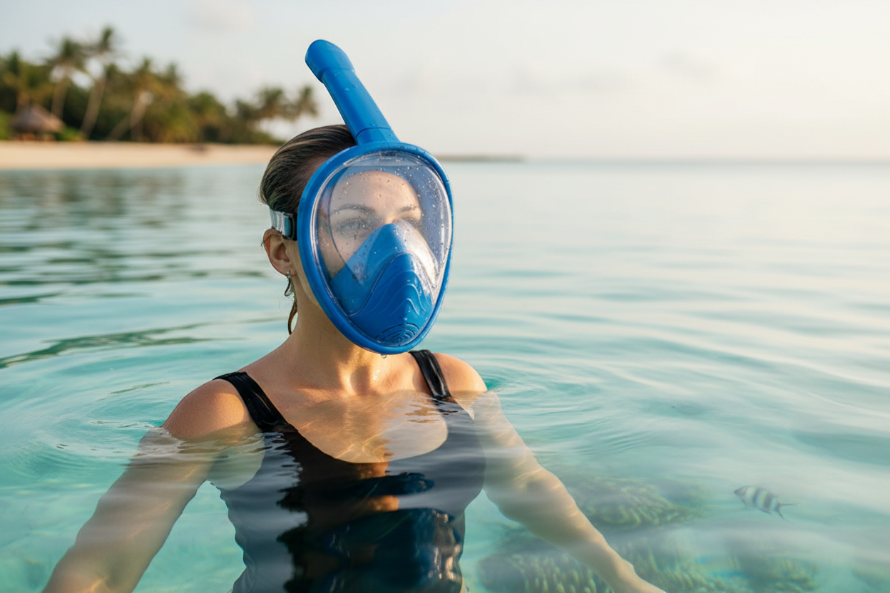 Μάσκα θαλάσσης πλαστική Full Face με ενσωματωμένο αναπνευστήρα που κλείνει αυτόματα κατά την κατάδυση, με πλήρη κάλυψη προσώπου που προσφέρει απόλυτη στεγανότητα και μεγάλο οπτικό πεδίο.