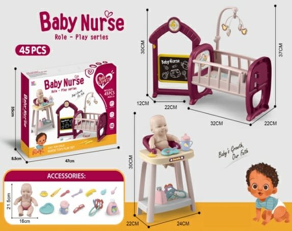 Πλήρες σετ φροντίδας μωρού με κούκλα, κρεβατάκι, καρεκλάκι φαγητού και όλα τα απαραίτητα αξεσουάρ για την ολοκληρωμένη φροντίδα και την περιποίηση του μωρού σου!