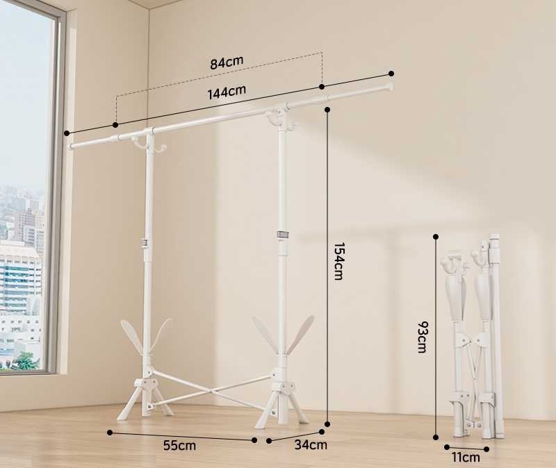 Πτυσσόμενη κρεμάστρα δαπέδου και απλώστρα ρούχων πολλαπλών χρήσεων, με μεταλλικό σκελετό, με γαντζάκια μικρών ρούχων και βάσεις παπουτσιών.