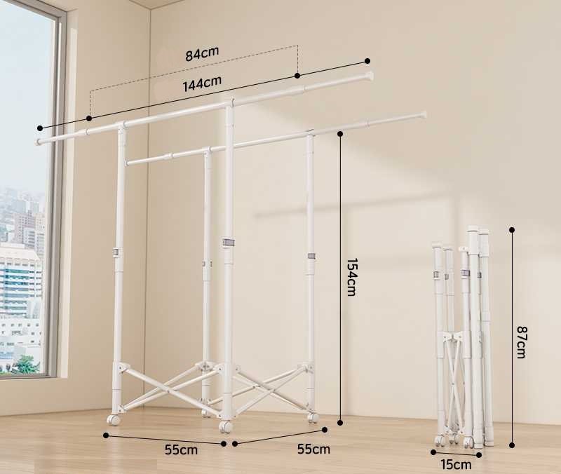 Πτυσσόμενη κρεμάστρα δαπέδου και απλώστρα ρούχων πολλαπλών χρήσεων, με μεταλλικό σκελετό και ροδάκια μετακίνησης.
