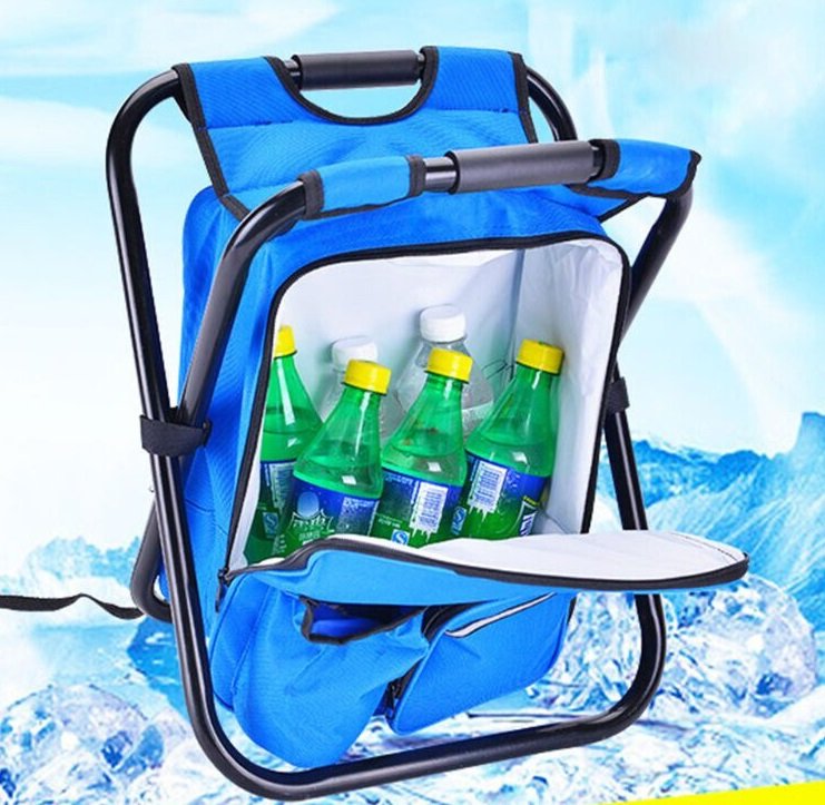 Πτυσσόμενο σκαμπό camping με ενσωματωμένο σακίδιο πλάτης και ισοθερμική θήκη-ψυγείο για να διατηρείτε δροσερά τα τρόφιμα και αναψυκτικά σας. Διαθέτει πτυσσόμενο σιδερένιο σκελετό που διπλώνει με μία κίνηση και πρακτικούς ιμάντες πλάτης για μεταφορά σαν σακίδιο. Ιδανικό αξεσουάρ για την εκδρομή, το camping, τη θάλασσα, το ψάρεμα κα.