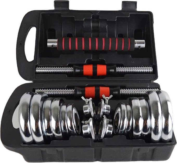 Πλήρες σετ αλτήρων σε βαλιτσάκι, μέγιστου βάρους 30 kg, με επιπρόσθετο τμήμα που βιδώνει στους αλτήρες και μετατρέπεται πολύ εύκολα σε μπάρα. Πολυλειτουργικό, σας παρέχει τη δυνατότητα μεγάλης ποικιλίας ασκήσεων, κυρίως του άνω κορμού, χεριών, στήθους και πλάτης, ιδανικό για αρχάριους και προχωρημένους. Το σετ περιλαμβάνει: