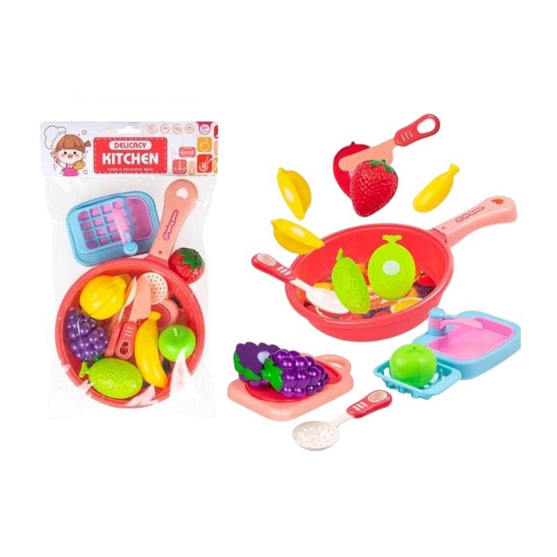 Παιχνίδι κοπής τροφίμων με πλήρες σετ αξεσουάρ σε υπέροχο ρεαλιστικό σχεδιασμό για ένα δημιουργικό παιχνίδι εξάσκησης δεξιοτήτων.