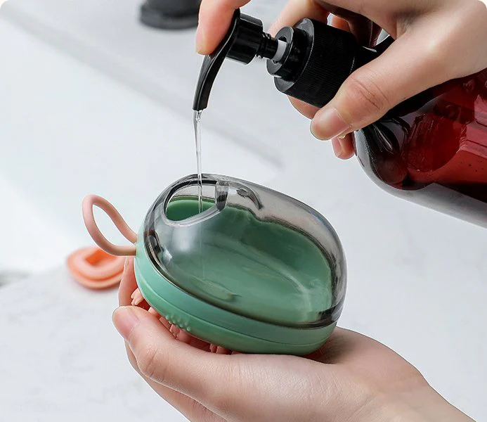 Βούρτσα κεφαλής μπάνιου με εργονομικό σχεδιασμό για άνετη χρήση και ενσωματωμένο δοχείο σαπουνιού.