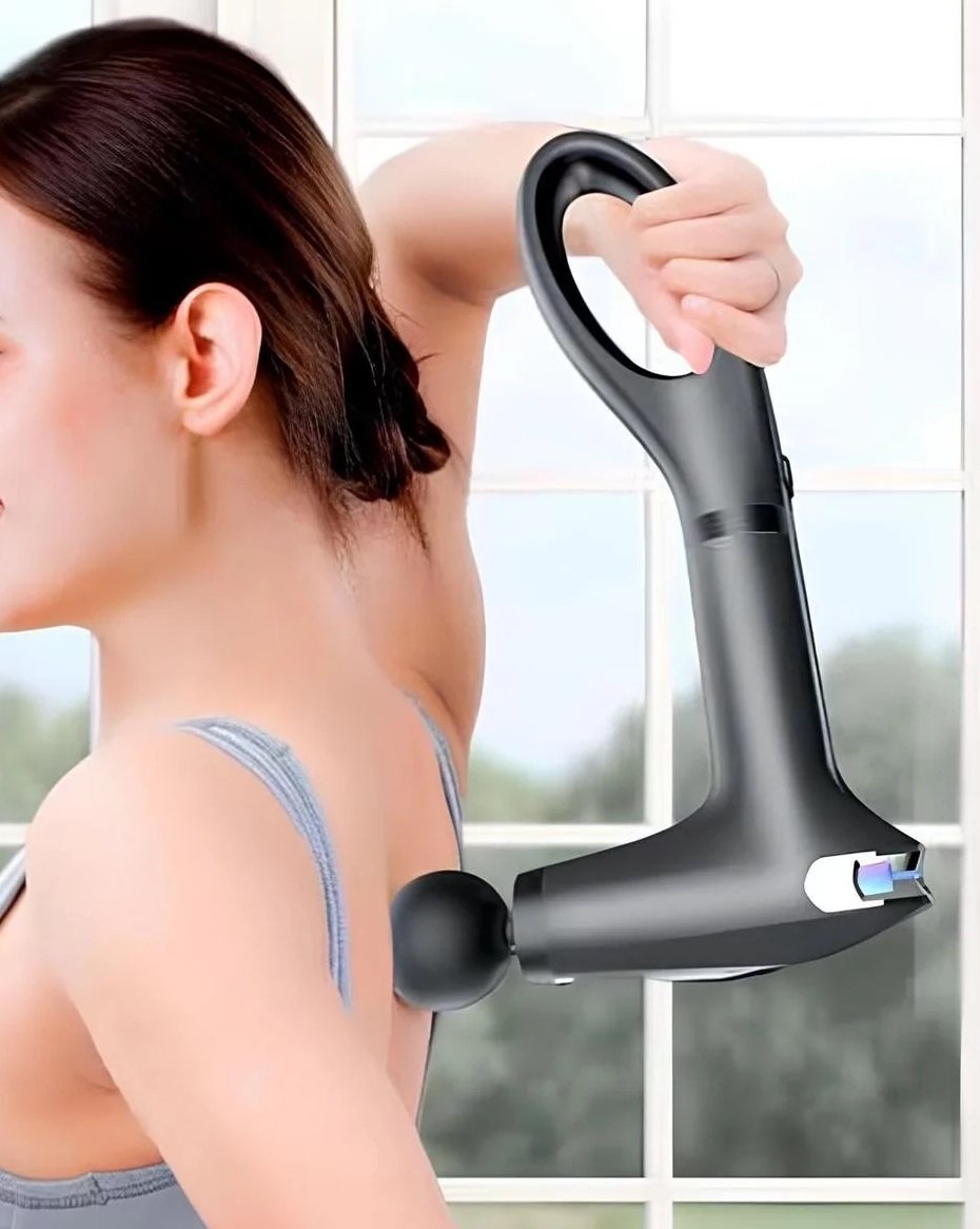 Επαναστατική συσκευή μασάζ και μυοχαλάρωσης Fascial Gun με εναλλασσόμενες κεφαλές και ειδική λαβή πλάτης, για εφαρμογή σε όλα τα σημεία του σώματος που επιθυμείτε.