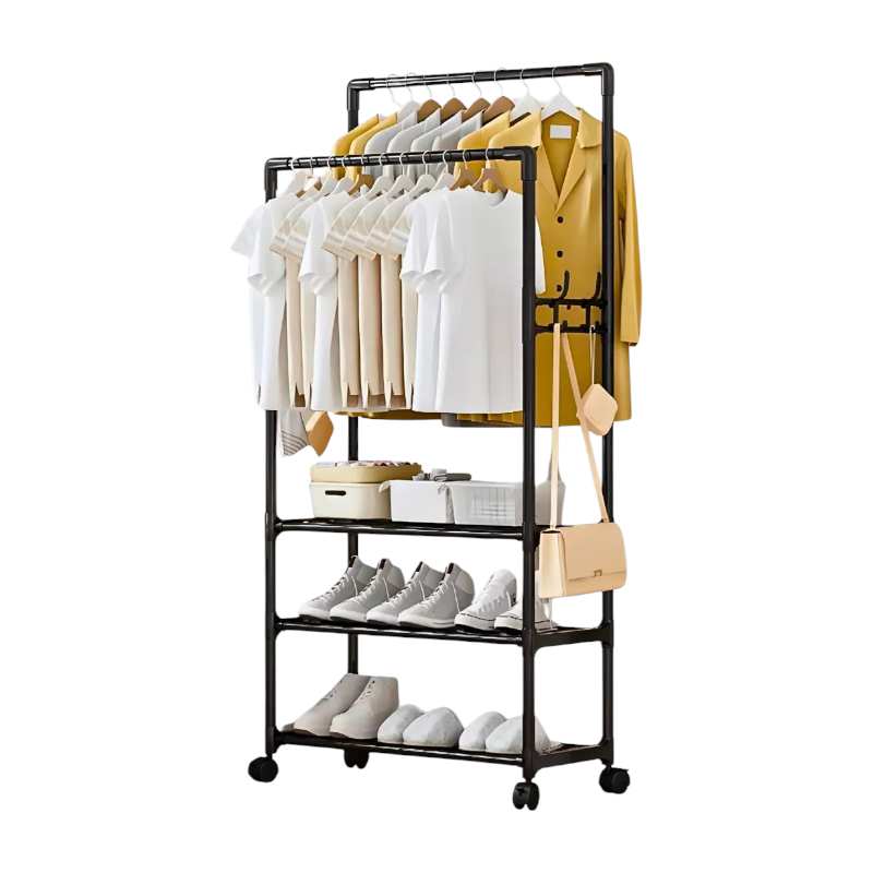Τροχήλατη κρεμάστρα δαπέδου μεταλλική, με 3 ράφια και πλαϊνές κρεμάστρες, ιδανική ως έπιπλο εισόδου ή για την οργάνωση των ρούχων στο δωμάτιό σας.