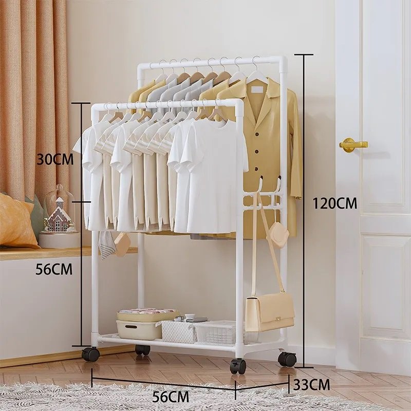 Τροχήλατη κρεμάστρα δαπέδου μεταλλική, με ράφι παπουτσιών και πλαϊνές κρεμάστρες, ιδανική ως έπιπλο εισόδου ή για την οργάνωση των ρούχων στο δωμάτιό σας.