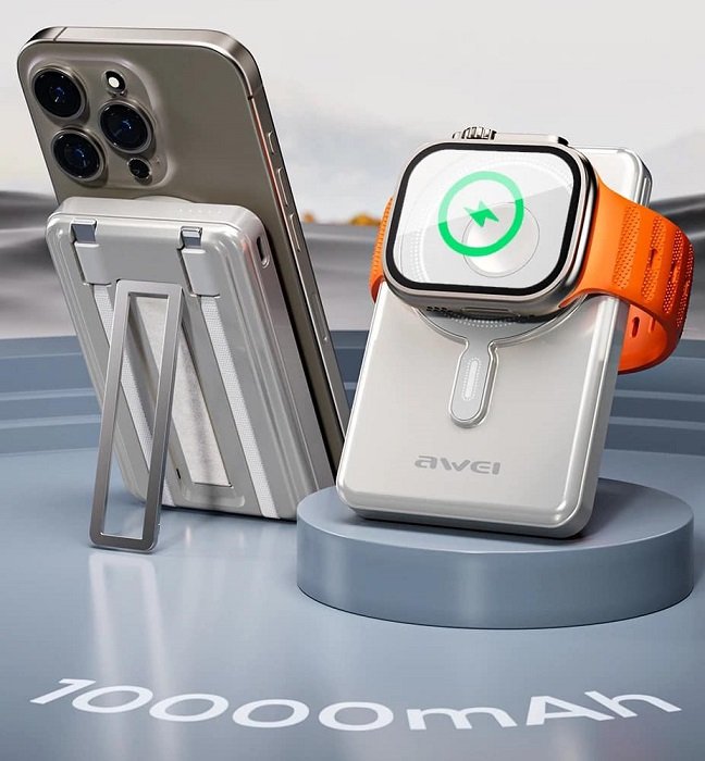 Powerbank ενσύρματης και ασύρματης μαγνητικής φόρτισης P92K από την AWEI με πρωτοποριακό σχεδιασμό, προσφέρει γρήγορη ενσύρματη φόρτιση έως 20W ενώ φορτίζει και ασύρματα τις συσκευές που το υποστηρίζουν (smartphone, smartwatch, earbuds) χάρη στη μαγνητική βάση φόρτισης MagSafe. Διαθέτει πτυσσόμενο σταντ επιτραπέζιας στήριξης για να μπορείτε να στηρίζετε το κινητό σας όσο φορτίζει μαγνητικά.
